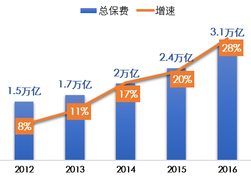 2016年,全行业共实现原保险保费收入3.10万亿元,同比增长27.50%,创2008年以来新高!