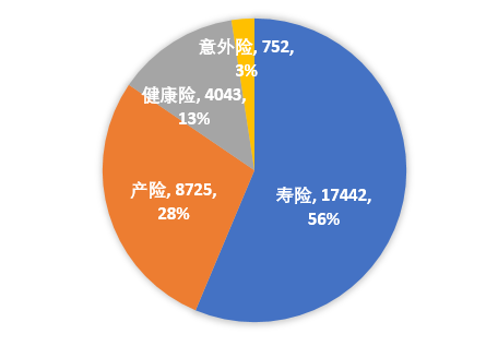 分险种看:寿险保费17442亿元,占总保费56%;产险保费8725亿元,占比28%;健康险保费4043亿元,占比13%;意外险保费752亿元,占比3%。