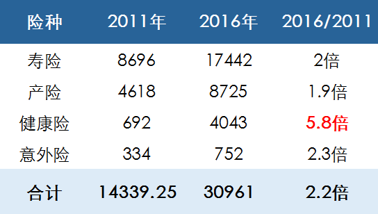 2011-2016这5年内,健康险增长了4.8倍,意外险增长了1.3倍,寿险增长了1倍,产险增长了90%。