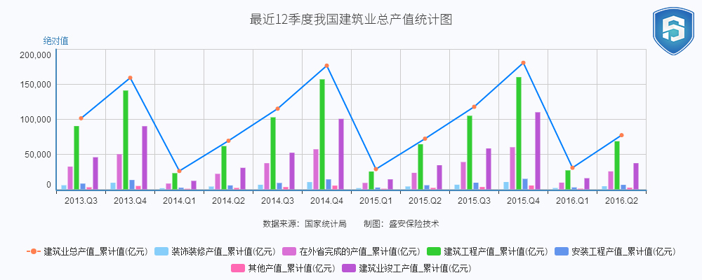 指标 建筑业总产值_累计值(亿元) 装饰装修产值_累计值(亿元) 在外省完成的产值_累计值(亿元) 建筑工程产值_累计值(亿元) 安装工程产值_累计值(亿元) 其他产值_累计值(亿元) 建筑业竣工产值_累计值(亿元) 2016年第二季度 77461.75 4446.43 25673.15 68701.03 6422.63 2338.09 37382.35 2016年第一季度 30849.97 1917.51 9604.82 27121.4 2766.16 962.41 15877.61 2015年第四季度 180757.47 10508.05 60203.54 160277.21 14982.48 5497.78 110115.93 2015年第三季度 117947.3 6640.06 39015.9 105109.57 9497.74 3339.98 58420.31 2015年第二季度 72374.43 4114.49 23581.08 64427.58 5863.07 2083.78 34465.24 2015年第一季度 28895.36 1773.66 9189.93 25435.52 2550.38 909.45 14281.96 2014年第四季度 176713.4 10373.1 57267.35 157142.51 14259.79 5311.1 100719.51 2014年第三季度 115247.52 6549.31 37370.24 102897.06 9090.44 3260.01 52288.32 2014年第二季度 69399.7 3995.39 22160.32 61768.53 5628.2 2002.97 30753.21 2014年第一季度 26238.12 1640.48 8266.61 23109.55 2302.13 826.43 12095.96 2013年第四季度 159312.95 9434 50192.88 141146.83 13355.2 4810.92 90198.65 2013年第三季度 101498.21 5841.32 32487.81 90363.26 8216.55 2918.41 45827.04 表1-1 最近12季度我国建筑业总产值统计表