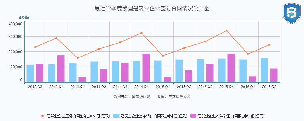 指标 建筑业企业签订合同金额_累计值(亿元) 建筑业企业上年结转合同额_累计值(亿元) 建筑业企业本年新签合同额_累计值(亿元) 2016年第二季度 244409.11 156559.81 87849.29 2016年第一季度 184072.67 147652.73 36419.95 2015年第四季度 338001.42 153599.87 184401.54 2015年第三季度 267314.01 150135.27 117178.74 2015年第二季度 222937.74 147462.93 75474.81 2015年第一季度 172031.45 139774.51 32256.94 2014年第四季度 323613.77 138930.45 184683.31 2014年第三季度 261256.93 135556.3 125700.63 2014年第二季度 216883.69 134021.99 82861.69 2014年第一季度 157456.64 123874.75 33581.89 2013年第四季度 289674.06 114825.21 174848.85 2013年第三季度 229320.53 112350.24 116970.29