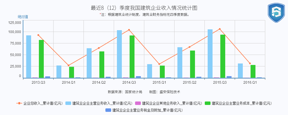 指标 企业总收入_累计值(亿元) 建筑业企业主营业务收入_累计值(亿元) 建筑业企业其他业务收入_累计值(亿元) 建筑业企业主营业务成本_累计值(亿元) 建筑业企业主营业务税金及附加_累计值(亿元) 2013.Q3 92902.66 92174.64 728.02 82217.49 3020.24 2014.Q1 26929.4 26729.33 200.07 23859.42 904.52 2014.Q2 64671.67 64234.1 437.57 57315.06 2158.36 2014.Q3 104206.8 103454.81 751.99 91964.03 3468.75 2015.Q1 29793.38 29587.33 206.05 26424.01 990.4 2015.Q2 66913.57 66411.27 502.3 59169.52 2195.31 2015.Q3 106085.58 105287.14 798.44 93721.65 3478.79 2016.Q1 31239.92 31062.12 177.8 27828.91 1018.62 表3-1 最近12季度我国建筑企业收入情况统计表